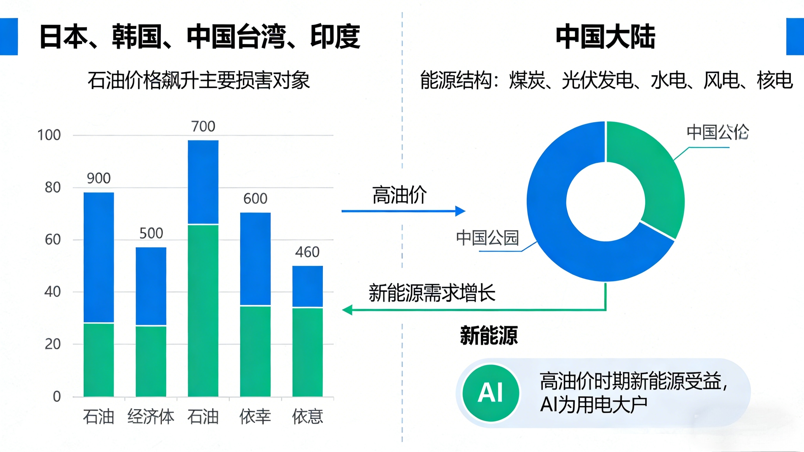 石油价格飙升,损害了日本、韩国、中国台湾和印度等经济体。对中国大陆影响相对小,国内经济依赖的能源主要是煤炭和光伏发电、水电、风电、核电。每次高油价时期,新能源都是大赢家。AI也是用电大户。横竖都是新能源赢。