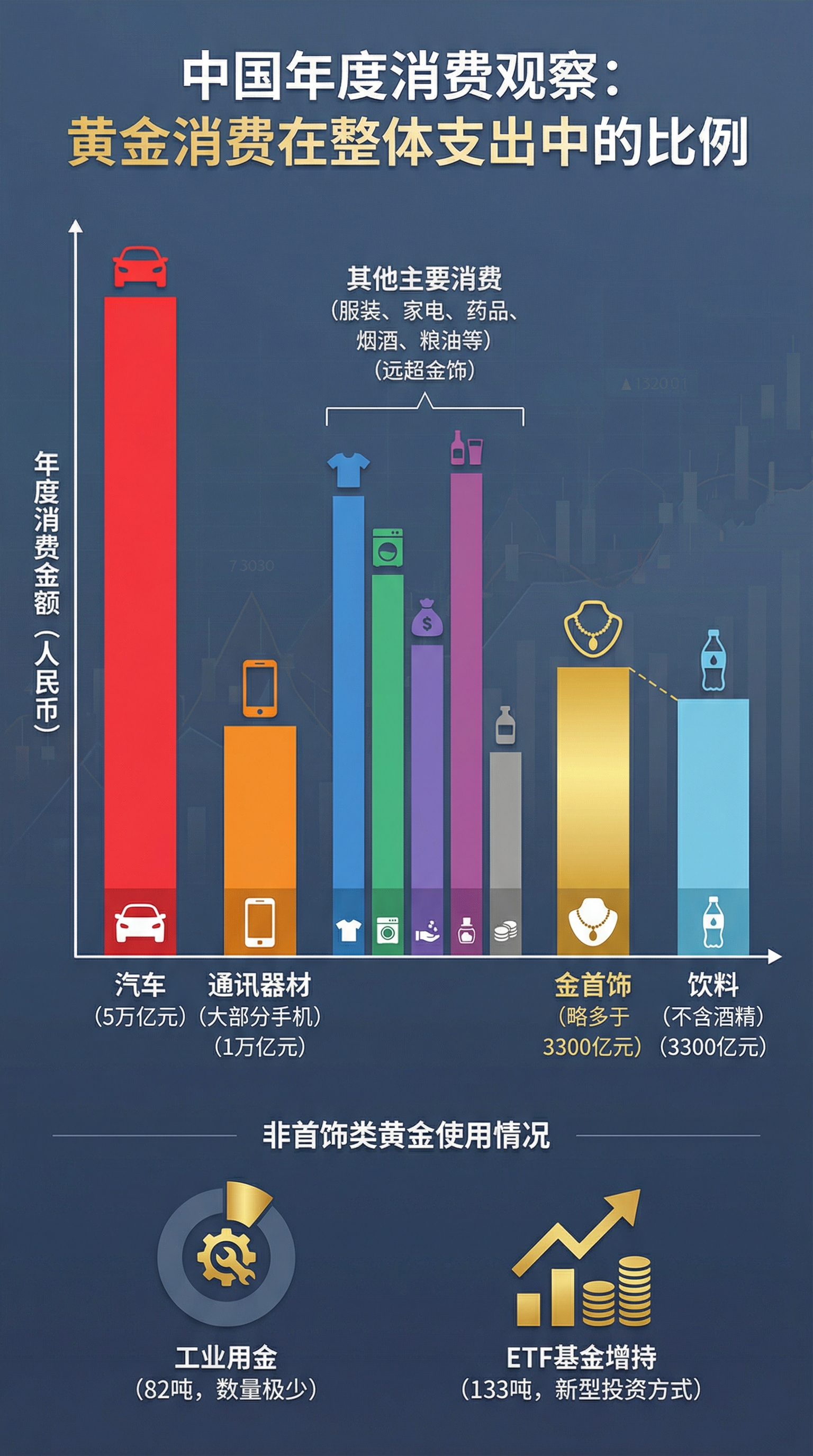 国内黄金消费横向对比其他类别的消费,比如手机,中国人一年花费1万亿元用于通讯器材,大部分都是手机;买车更不用说是大头,年消费5万亿元。中国人买金首饰的钱,也就是刚刚多于买饮料(不含酒精)的钱,买饮料花费3300亿人民币。其他消费类别例如服装鞋帽、家电、中西药品、烟酒、粮油食品无一不是远远超过金银首饰。除了买金条和金首饰之外,中国一年工业用金82吨, 数量非常少。ETF基金作为黄金的新型投资方式,增持了133吨,日益成为重要的买金力量。此外,通过金融机构购买的纸黄金、各种黄金衍生品,为数不少。