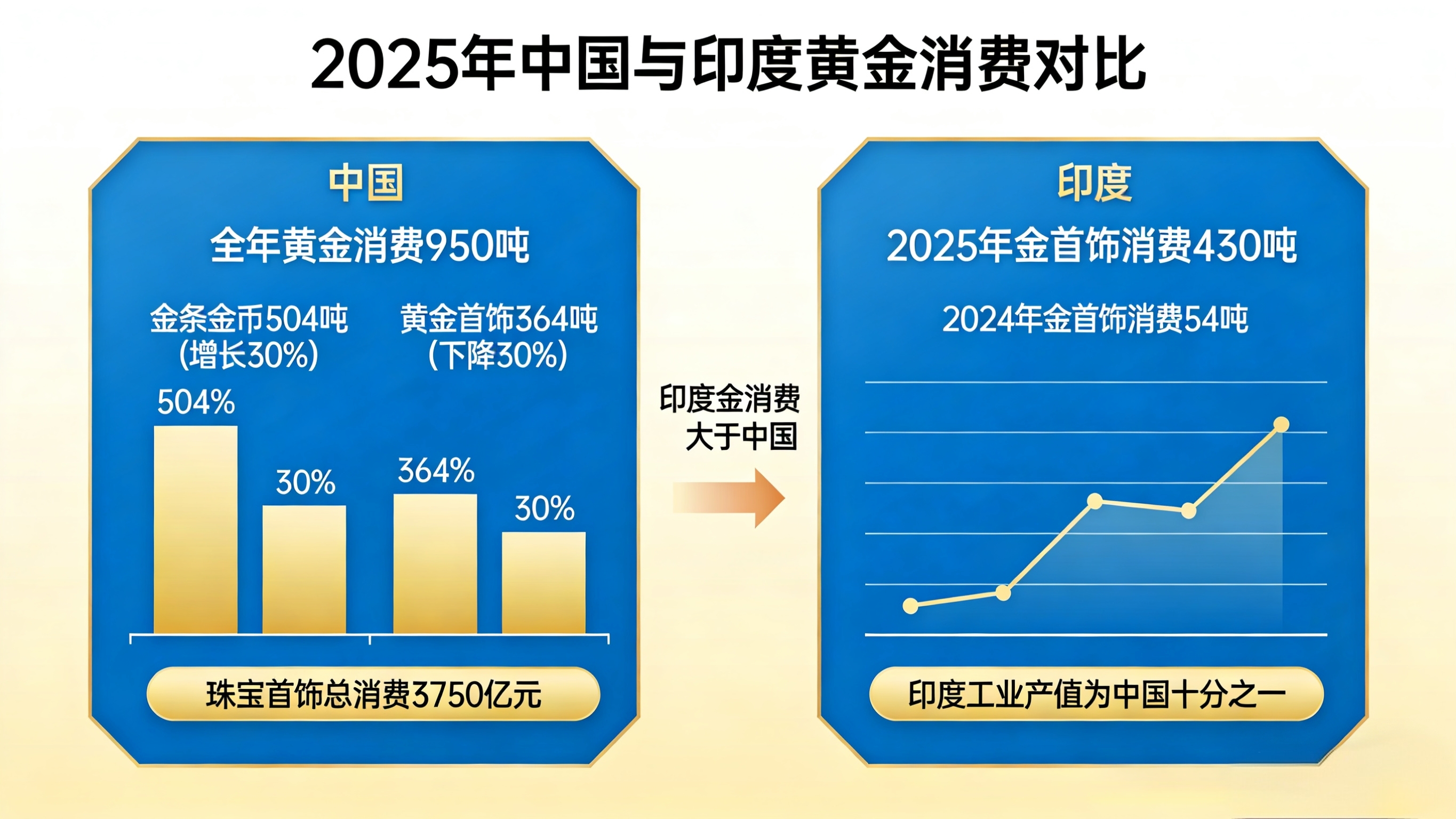 黄金价格近两年涨幅很大。暴涨的黄金价格有没有实际消费作为支撑?首饰用黄金每年有多少? 最近中国黄金协会公布了最新情况: 2025年全年,中国一共“消费”了950吨黄金,其中金条和金币504吨,增长了三成,因为买金条更多是投资属性,所以真正的黄金消费,也就是买黄金首饰,总共364吨,下降了三成。所有的珠宝首饰加总一共消费了3750亿元,从这个角度看,国人对于珠宝首饰的消费还是非常节俭的,甚至不如印度人,印度人2025年买了430吨金首饰,2024年买了540吨金首饰。印度的工业产值真实规模只有中国的十分之一,经过多年的财富累积完全不是一个量级,但是印度的黄金消费大于中国。
