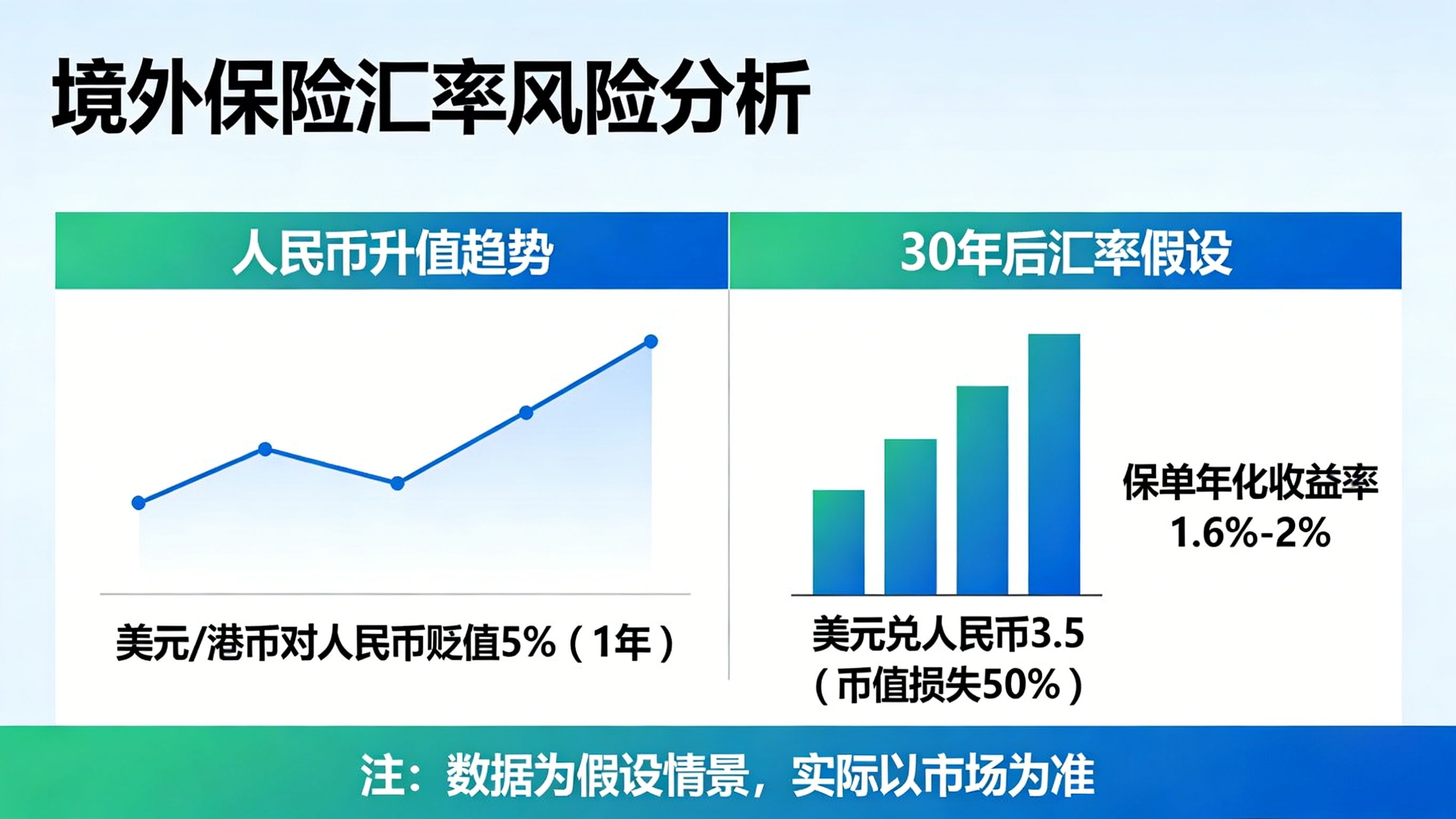 最近两年特别流行的一种“理财”方法,买境外保险,保单持有人现在傻眼了。人寿保险这玩意,突出两个字——锁定!锁定汇率,锁定利率,三十年不变。可是世界变化很快啊,三十年沧海桑田,得发生多大变化啊。买境外保险相当于锁定了汇率,人民币升值美元港币贬值,一年不到贬值5%上下。大问题不是现在,三十年之后汇率是多少?如果那个时候美元兑换人民币是3.5,岂不是币值上就损失一半价值?那样的话,即便保单收益率购买时候比较高,三十年下来年化收益率不过只是在1.6%-2%之间 ,费那个劲还不如在国内存银行,想用的时候还能随时取用。